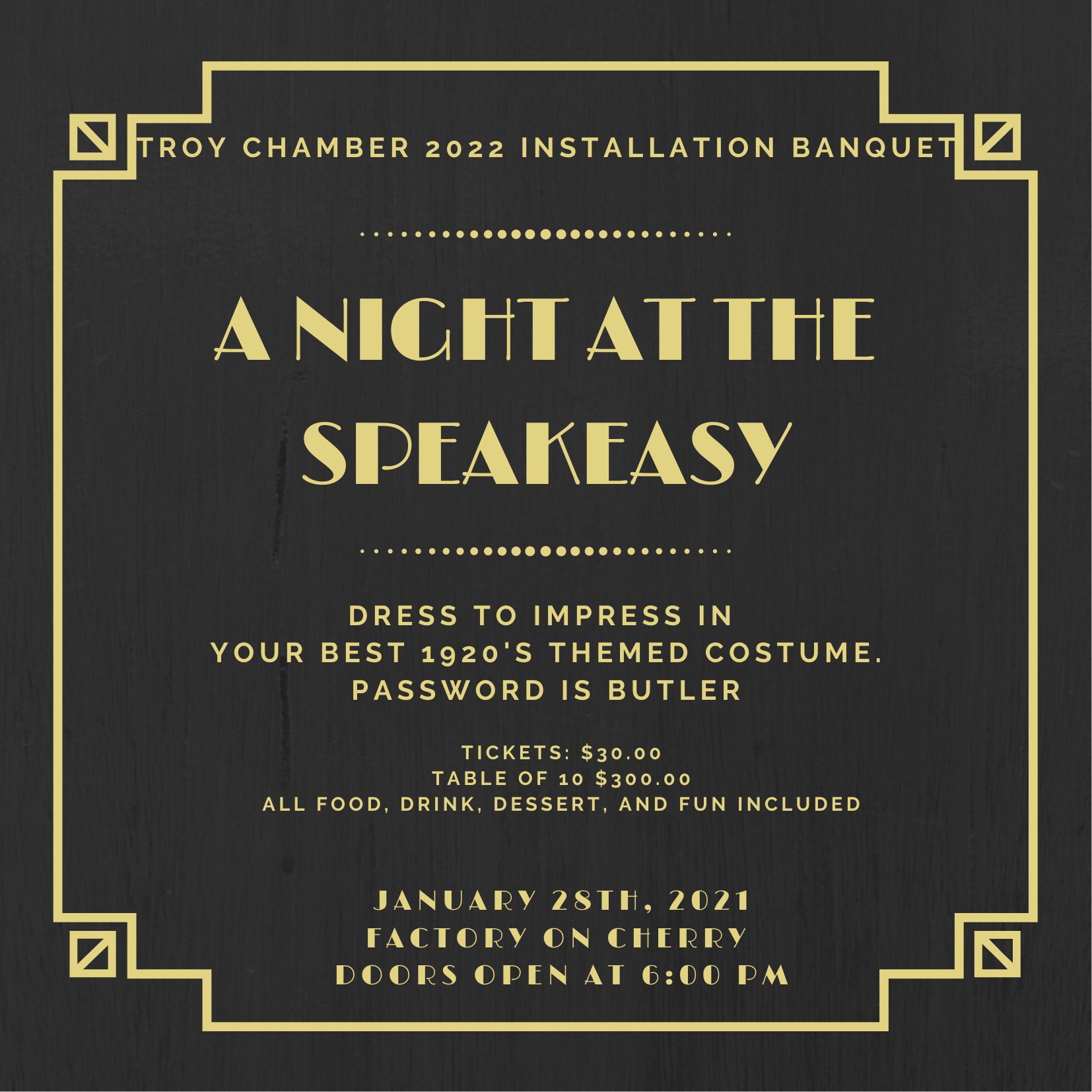 SHHHHH!! You will need the password to join us for a "Night at the Speakeasy"! We promise a night filled with entertainment, food, drinks, and some fun surprises along the way! We will be installing our 2022 President Justin Butler and our board of directors. We will also reveal 2022's Man, Woman, and Give Back Award Recipients. 20's themed attire is strongly encouraged! Tickets cover all food and drinks! Use the special password "Butler" to get access to the evening's themed drinks! So mark your calendar and join us as we relive Troy's Speakeasy Days!